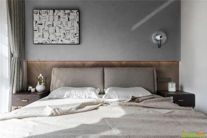 主臥的背景墻灰色與木色,一個溫暖一個冷靜和抽象的畫面形成空間構(gòu)成。