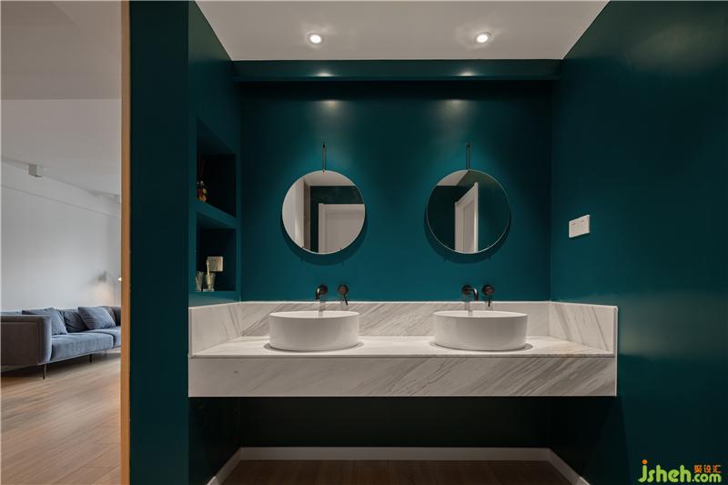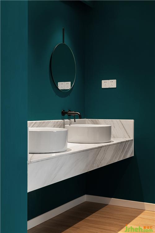與主臥相鄰的盥洗室,與之呼應(yīng),運用了同色調(diào)。在保證干濕分離的同時,設(shè)計師最大化利用空間增加了雙臺盆設(shè)計,展現(xiàn)了設(shè)計師對營造高品質(zhì)生活的追求。