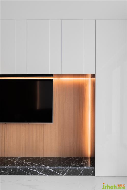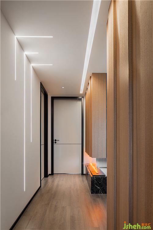 △通往主次臥的廊道以暖木色材質(zhì)為主,烘托出溫馨的質(zhì)感。照明以嵌燈為主讓整體空間更潔凈內(nèi)斂。