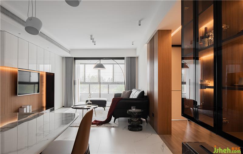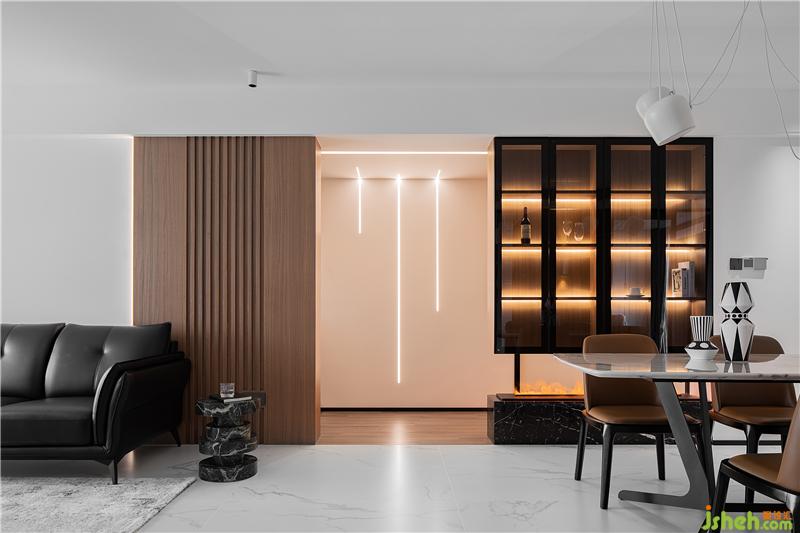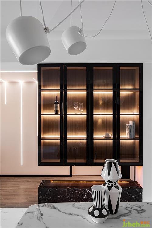 一旁的餐廳背景設(shè)計為黑框玻璃展示柜,其上部從頂面往下生長,
