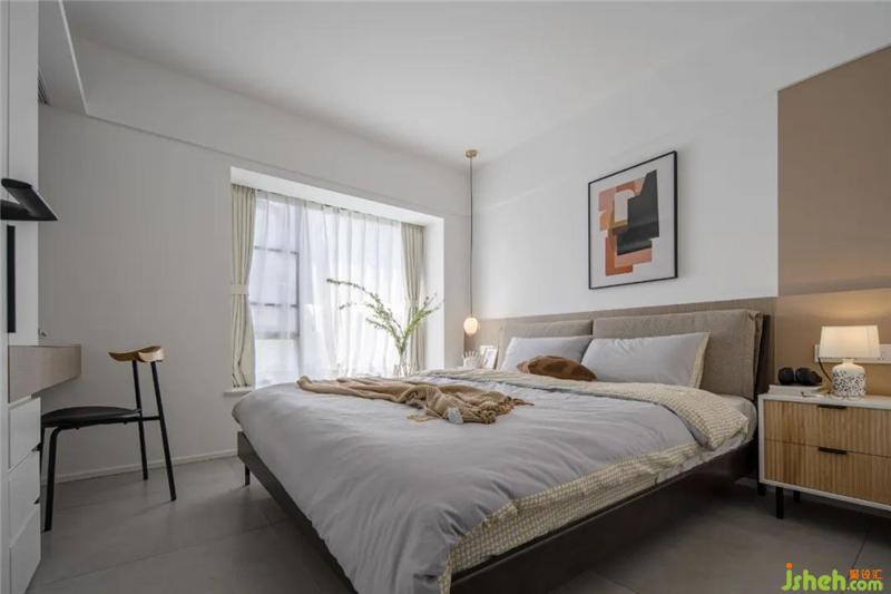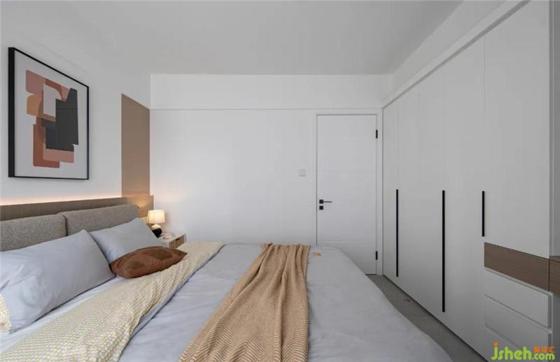 床尾一整排超大的收納+梳妝臺的結(jié)合,滿足強大衣物收納的同時最大化利用空間,白色的柜門與整體的墻面一致,整體干凈美觀。