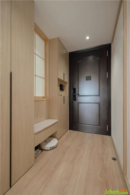 玄關(guān)的雙邊鞋柜和中間的換鞋區(qū)做了對(duì)稱的設(shè)計(jì),換鞋凳下方留有掃地機(jī)器人的位置,上方的窗戶和廚房互通,增加了趣味性,也開闊了空間。