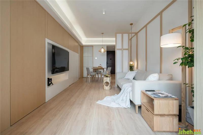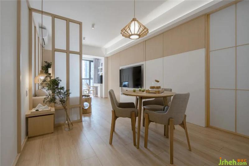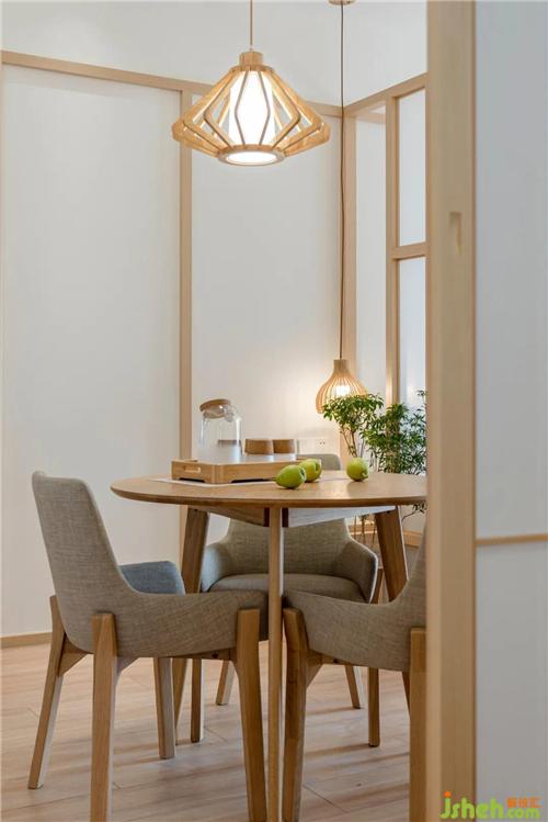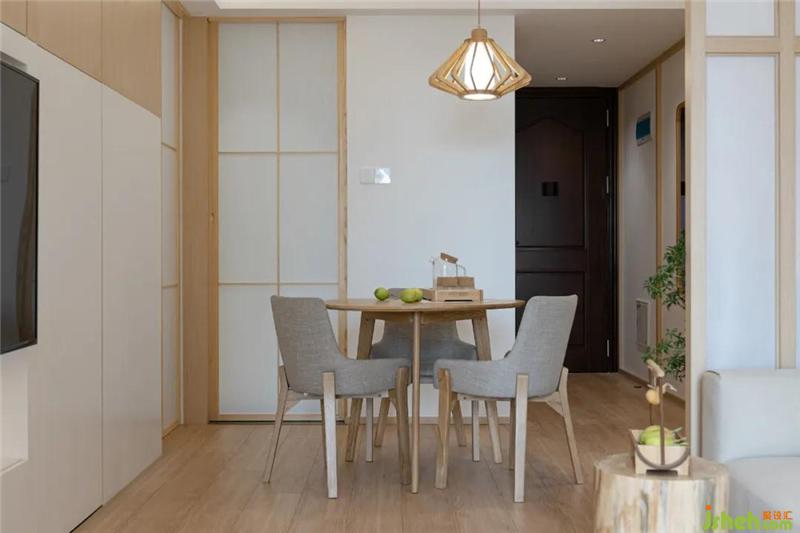 玄關(guān)望向餐廳,整個(gè)空間通透明亮,采光極佳。日式風(fēng)格中白色與木色的使用都能起到很好的提亮效果,溫馨卻不壓抑。