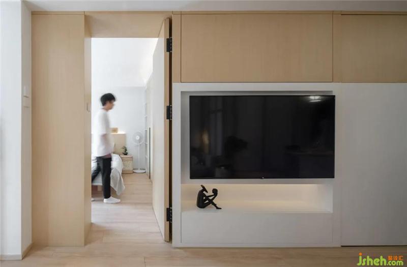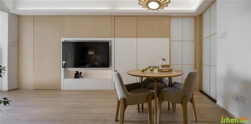電視背景是由兩個(gè)隱藏門+電視柜來(lái)組合而成的,用了一些現(xiàn)代顏色撞色的手法,讓空間在色系不變的情況下更為整體深圳裝修設(shè)計(jì),衛(wèi)生間的隱藏門也是木飾面+噴漆的工藝,讓電視墻在視覺(jué)上得到延伸,再結(jié)合書房和廚房日式門的元素,顯得整體自然。