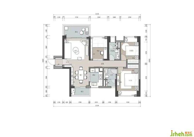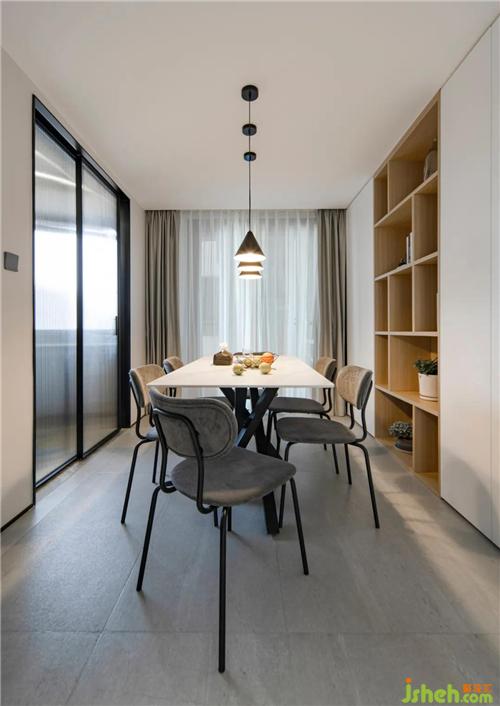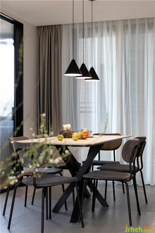 餐廳區(qū)域在家具的選擇上,大理石臺面的餐桌與體型較輕巧的灰色餐椅組合,具備質感卻不會顯得笨重。