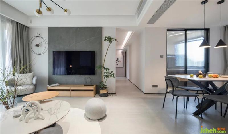 客餐廳為一個整體,兩邊的陽臺通透讓空間更加明亮。電視背景墻采用深灰的巖板+乳膠漆,兩種材質結合,突出墻面的層次感的同時更具質感,巖板帶來的冷冽剛好能被乳膠漆柔和。前期與屋主的溝通過程中,粗糙紋理及表面的石材更適合這個家,所以選擇了石材作為背景墻的主要材料,區(qū)別于一般的全乳膠漆背景墻及全巖板背景墻,更具特色。