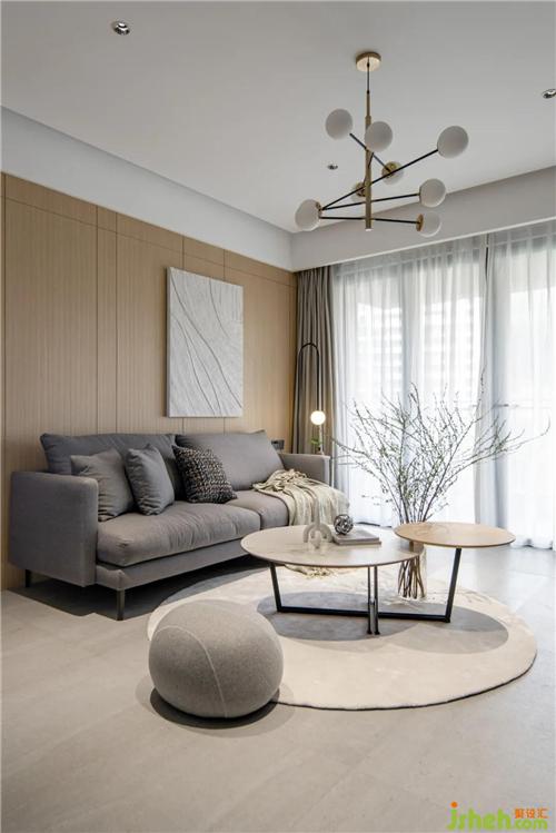 木飾面背景墻將沙發(fā)區(qū)域包圍,包括門的材質保持一致性,讓沙發(fā)背景墻形成一個整體.