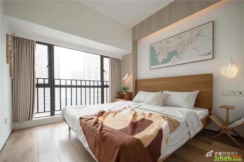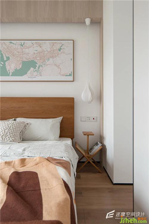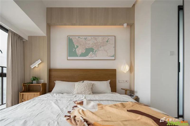 臥室的色調(diào)及風(fēng)格與客餐廳一致,床頭背景木色區(qū)域結(jié)合三大體塊穿插設(shè)計(jì),在視覺(jué)上更加立體化,層次感滿滿,內(nèi)藏?zé)魩Ц邷剀胺諊鷡 在軟裝的選擇上,床具簡(jiǎn)約的線條,加上柔和顏色的床品,既美觀又舒適~兩邊簡(jiǎn)潔可調(diào)節(jié)的壁燈+吊燈組合,風(fēng)格一致而又個(gè)性明顯的床頭柜,不對(duì)稱的美感,增一分顯得多余,減一分顯得寡淡,一切都是美的剛剛好~