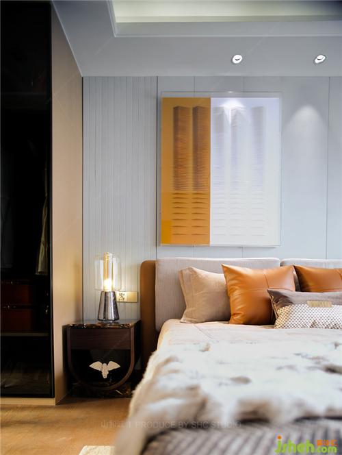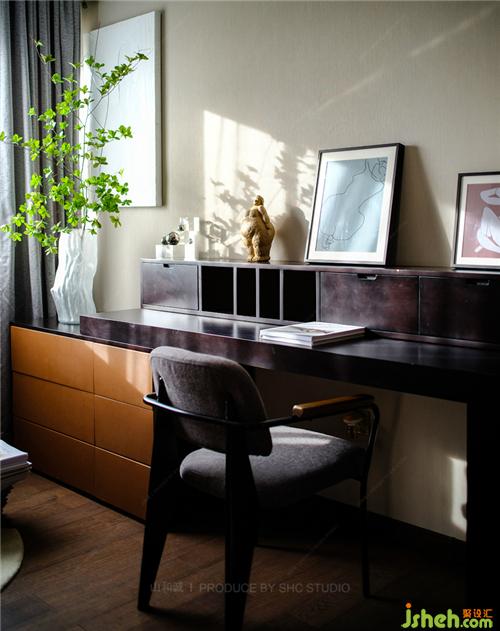 書房延續(xù)空間的整體色調,作為男主人的個人空間,裝飾上更顯大膽,皮革、金屬石材、布藝增添層次感,局部配以時尚藝術品,不同的材質與材質與觸感都營造著室內的高級精品與藝術感,彰顯男主人的格調。