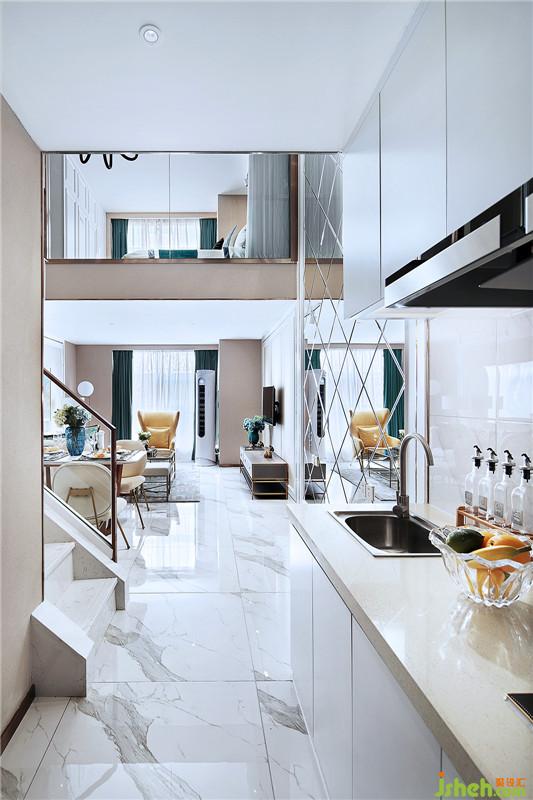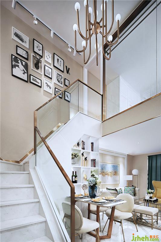 Under the stairs is the wine cabinet, white paint, built-in lamp, above the restaurant is the chandelier, the material is rose gold stainless steel, the designer hopes that the material is uniform and simple.
