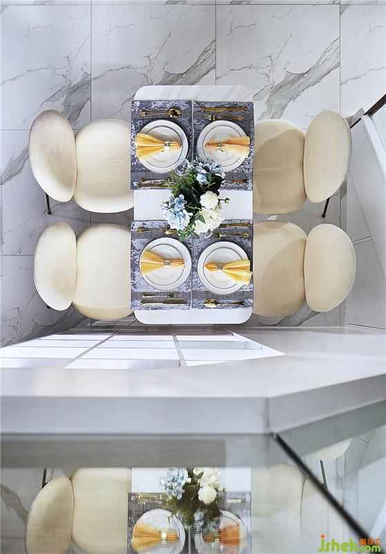 The dining room table is made of Yashi white marble, which is unified with the floor tiles. The color of the napkin and the chair is unified, but the purity of the chair is reduced by three degrees. This is very harmonious. The table mattress is moderately gray with a little blue and flowers, and the knife and fork are unified with gold and the surrounding rose and gold.