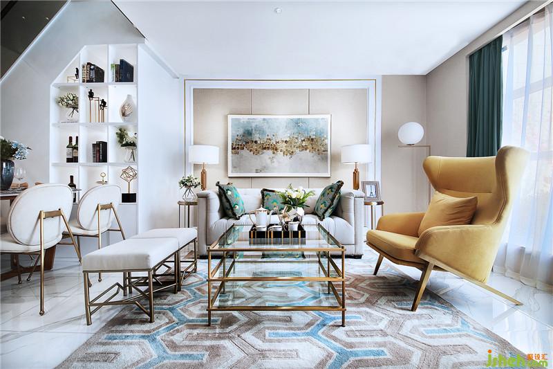 軟裝在一個空間里是非常重要的,軟裝搭配上要注意前景和背景的關系,要做色彩的關聯(lián)性和協(xié)調(diào)性,這里的掛畫的藍色和地毯的藍色是有關聯(lián),窗簾的綠色和抱枕的綠色是有關聯(lián),椅子的黃色和畫中的黃色是有關聯(lián),但這些顏色不處理好它的前后關系就會很亂,在這里設計師是通過色彩的純度和飽和度來確定它的前后關系。
