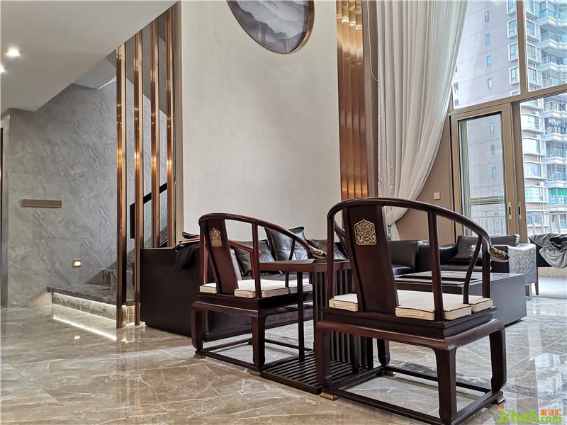 本項(xiàng)目面積為270方三層復(fù)式中空大廳戶型。風(fēng)格定為現(xiàn)代時(shí)尚的新中式風(fēng)。業(yè)主為職業(yè)教師,對(duì)美艷的新中式風(fēng)尤為喜愛,設(shè)計(jì)時(shí)在現(xiàn)代時(shí)尚的手法上僅在意境上體現(xiàn)著簡(jiǎn)約中式的表達(dá)方式,讓人既享受到時(shí)尚的優(yōu)雅,又感受到中式意境之韻,格調(diào)顯貴。本案例運(yùn)用了大自然的天然石材-白金沙,該石材無論色澤或是紋理都渾然天成,一氣呵成,大氣灰宏,給人視覺沖擊甚為之高。整體空間均輔以奢華為代表的玫瑰金不銹鋼為裝飾線條,提升出時(shí)尚而奢華的空間氛圍和品位,兩側(cè)6米高的不銹鋼造型屏風(fēng)以斜角45度為擺向,正如展示著主人趟開雙臂歡迎賓客一般,熱情,友愛,無比活躍。沙發(fā)背景墻面留白的處理,中間鑲嵌了一個(gè)整圓以美倫美奐的不銹鋼為邊,透著抽象的高低起伏的山群玻璃造型,正如每逢月圓人團(tuán)圓的意境,更是增添了一份中式的神韻在此。室內(nèi)設(shè)計(jì)師