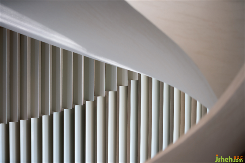 邏輯并不復(fù)雜的“波浪”立面,將白色的層次與光線制造的陰影相互交織切割,形成一種連貫的視覺(jué)呈現(xiàn),逆向的模塊翻折詮釋出空間層次的內(nèi)在涵義。幾何結(jié)構(gòu)的拼接曲線引入另一個(gè)視覺(jué)角度,不同時(shí)光于是有了不同“景觀”的呈現(xiàn)。