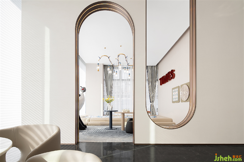 樣板房設(shè)計(jì)透明輕盈的頂部吊燈,隱隱透著兒時(shí)嬰兒床頭所掛玩具燈的影子,區(qū)域內(nèi)較為疏松的家具單品,釋放出感官的輕松,熊貓雕塑與室外空間中的另一只相呼應(yīng),仿佛在訴說一個(gè)“熊貓到此一游”的故事。將空間歸還給孩童的本性,讓玩耍與童趣更加純粹。