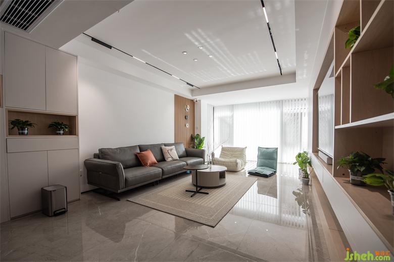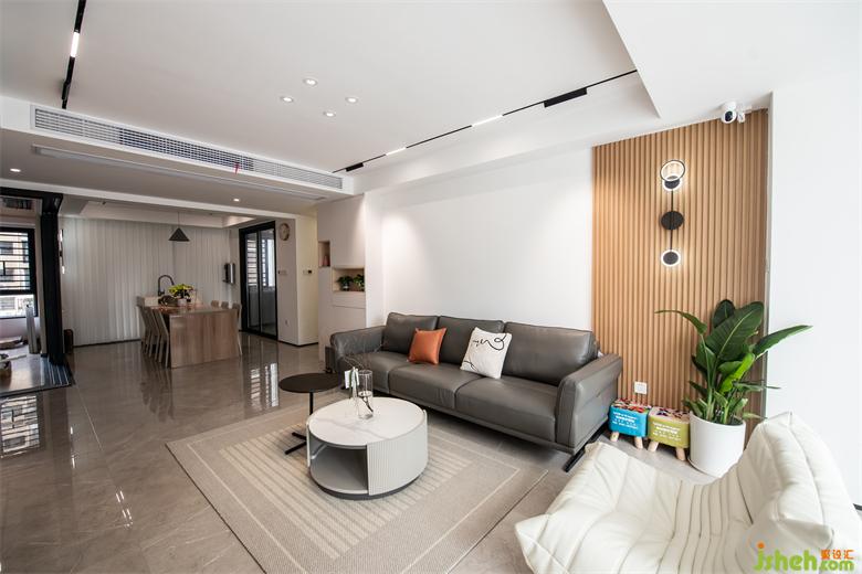 空間以白色及木色調(diào)為基底,大平層裝修設(shè)計(jì)搭配灰色的皮質(zhì)沙發(fā)、夢(mèng)幻簾,在良好的采光下?tīng)I(yíng)造出透亮潔凈的視覺(jué)感受。