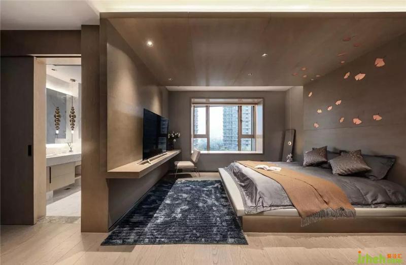 在主人臥室里設(shè)計(jì)師依然希望通過(guò)場(chǎng)景留住時(shí)間,想法來(lái)自攝影??臻g的構(gòu)造猶如相機(jī)的取景框?qū)χ巴獾木吧?,按下快門,床背景的銀杏葉通過(guò)燈光由金色變成橙色,寓意著和諧共處的珍貴。