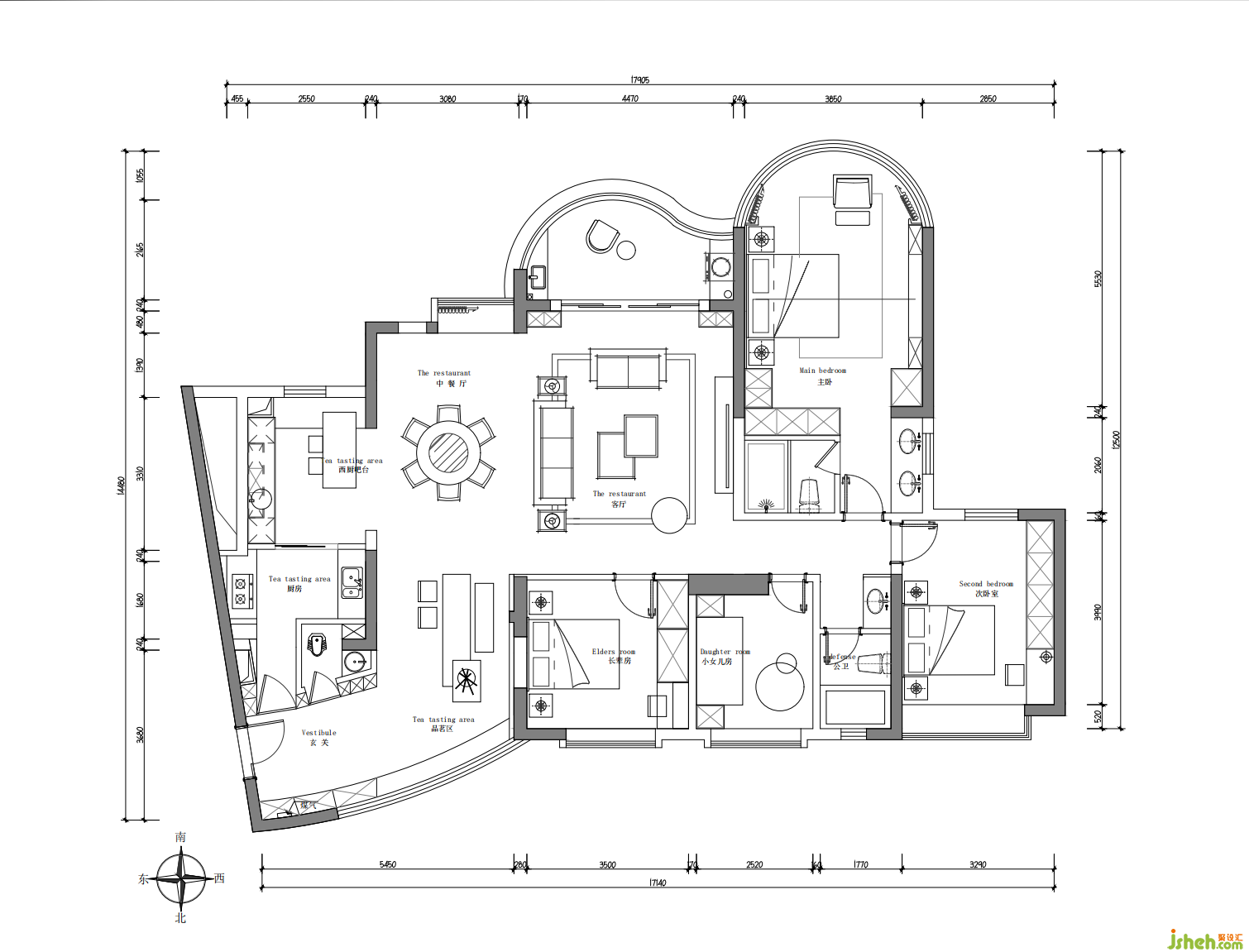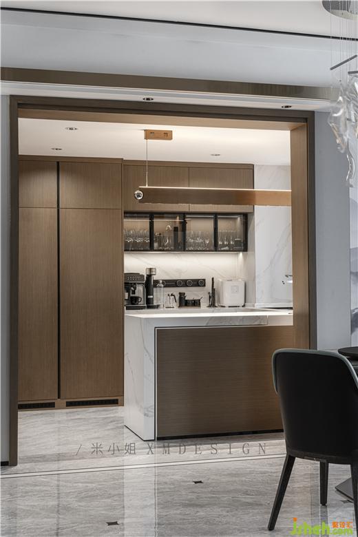 廚房墻體使用大理石花紋,如悠悠水墨般盡顯古韻,圓形餐桌搭配中式吊燈,古典寧靜的用餐區(qū)溫馨治愈。開放式廚房的設計,家裝設計流暢的動線符合人體運動學原理,更為便捷滿足。