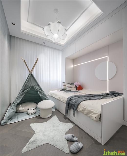兒童房以低飽和度的粉色營造溫柔舒適的睡眠空間。床的擺放讓坐在床上的人能一眼珠江夜景,家裝設計堪稱完美。這也不無體現(xiàn)主人對生活的無限向往。