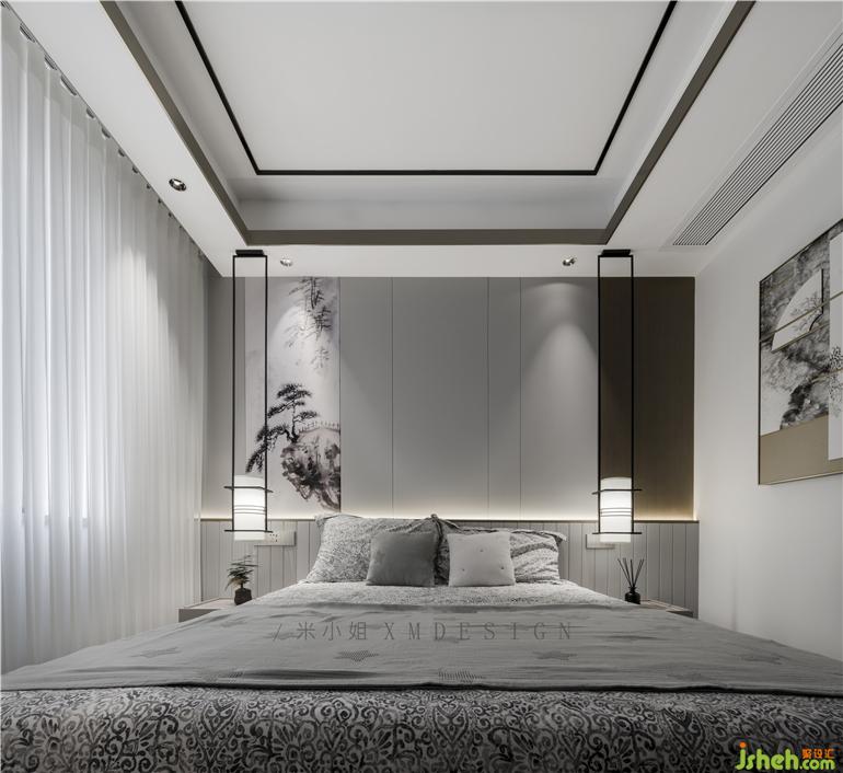 次臥多重中式元素輔以軟包點綴,中式床頭搭配錯段的山水畫,家裝設計讓整體空間明亮通透,于不刻意間刻畫出最極致的東方生活美學。