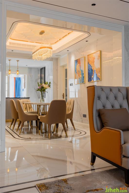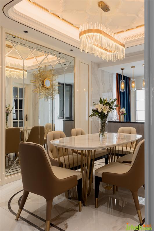 餐廳區(qū)域則以大面積的車邊棱鏡做裝飾,鏡子反射餐桌及餐桌上的菜肴,在視覺效果上使得食物更加豐盛。