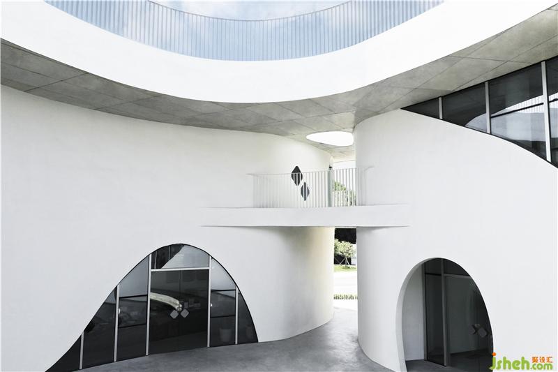我們在位于成龍大道的主入口廣場上打造了層巒迭嶂的小山丘,如伸出的雙手般進(jìn)行流線配置,并通過地形的高低起伏,過濾面前道路的嘈雜紛擾。蜿蜒的車道設(shè)計(jì),緩和了車行速,轉(zhuǎn)換成輕松閑適的入園心情。規(guī)劃上以人車分流為主,停車場位于建筑人工地盤下;人行的動(dòng)線,則順著景觀流線,由大階梯延伸到園區(qū)內(nèi)。