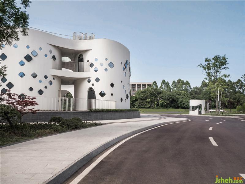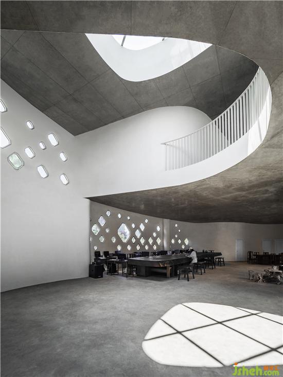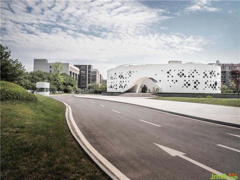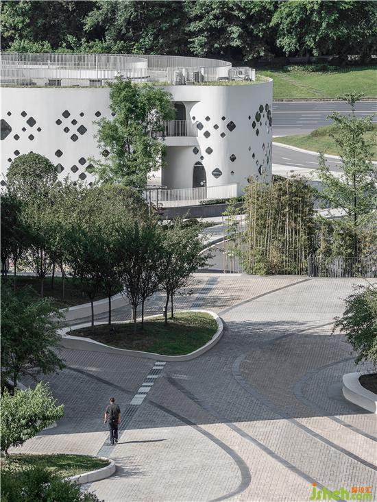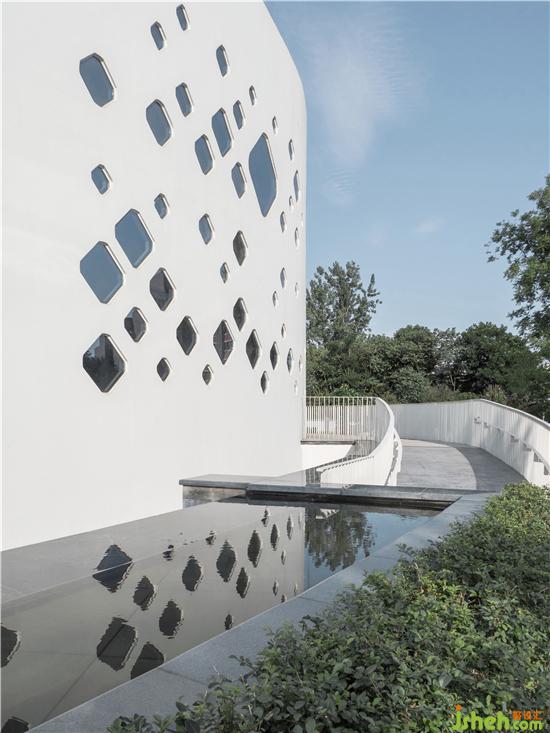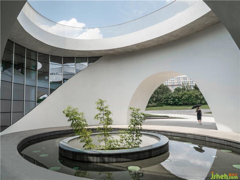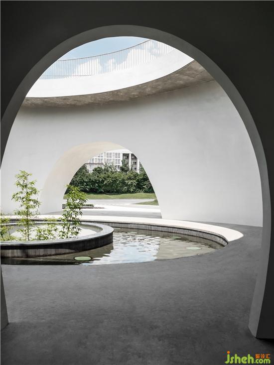 文化中心以一種富有生命力的地景角度切入,純粹的橢圓體轉(zhuǎn)動構(gòu)成的動感漣漪紋理,為環(huán)形建筑的動線原型。借由圓圈的生成,構(gòu)成多層次的空間邏輯,達到一種互為表里的空間體驗。人們在此自由進出,由弧形的拱墻和精致的天窗, 感受通透和輕盈的品質(zhì)。環(huán)繞的空間將休閑、展覽、會議、接待、辦公、飲食等使用融合一體, 營造出親切友好的感受。外觀色彩賦予其水的氣質(zhì), 潔凈的白色墻體,更好的呈現(xiàn)出生動的光影。外部特殊設計的平推窗,具有調(diào)節(jié)光線和溫度的功能。由混凝土構(gòu)成的原始空間結(jié)構(gòu),在大面的落地窗分割下,模糊了中庭的界線。上方的天窗與外側(cè)透進的水滴光點, 形成的曲線與孔洞,自然又親切。建筑中在屋頂綠化上考慮到綠能環(huán)保,采用自然館內(nèi)溫度的調(diào)節(jié)方式,回收雨水,做造景水池。小白樓一方面與其所在的歷史背景建立了對話,另一方面也作為企業(yè)孵化園公共性的建筑,吸引著人們來探訪。自然的力量構(gòu)筑成建筑主體, 最終形成一個強有力的符號,與眾人分享。