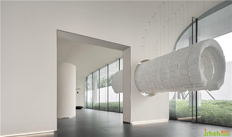 步入內(nèi)部,紙質(zhì)的巨型長筒裝置穿插于空間中,視覺也隨著裝置透過墻壁穿梭,呈現(xiàn)出空間的豐富性和新穎性,凸顯了美術(shù)館般高雅的藝術(shù)氛圍。優(yōu)美靈動的弧線造型在空間中不同的肆意綻放,移步換景,咫尺之內(nèi)再造乾坤,伴著步伐穿梭旋轉(zhuǎn)盡情享受視覺上的新奇的體驗(yàn)。