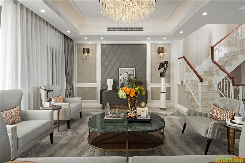 樣板房設計客廳空間通透明亮,舒適大方,一覽無遺。頂燈絢爛與掛畫抽象,如“了不起的蓋茨比”電影里,鎏金歲月,如夢似幻,亦真亦假。