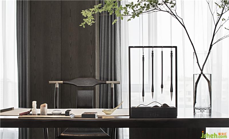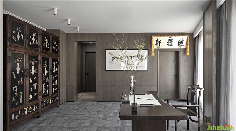 客廳一隅,是中式書房,文房四寶、浮雕立柜,深色原木紋裝飾,會所設計簡單不失雅致,厚重不失冷靜,端的是鬧中取靜,修身養(yǎng)性。