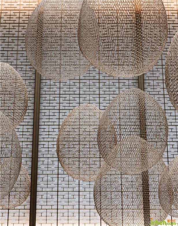 銅色不規(guī)則金屬球懸于半空,半透明的立體感打破中式的對(duì)稱的厚重感。整個(gè)畫面層次分明,方圓有道,上下隔斷的方式使得極高的挑高不至于空洞,采用金屬質(zhì)感的中式窗欞圖案,華麗卻不失典雅。