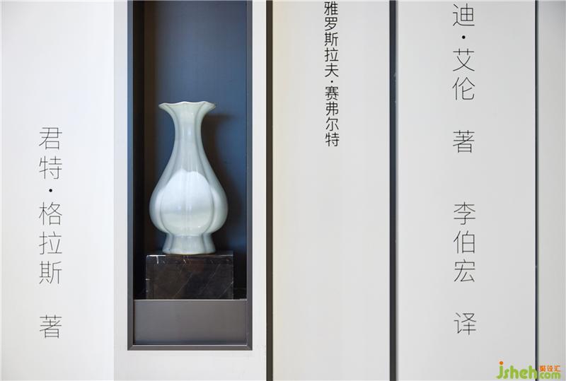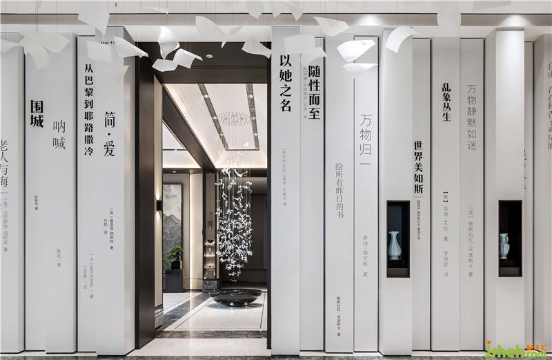 售樓處設(shè)計(jì)以書的厚薄高低無(wú)序排開,堆砌成墻體,有中式的無(wú)聲《吶喊》,也有西式的“靜默如迷”,紙張紛飛,筆劃垂如絲絳。就像把書桌放大100倍,人如螻蟻,一道窄門開啟學(xué)海無(wú)涯的人生。