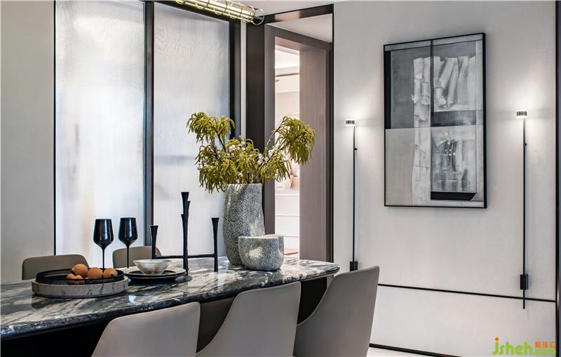 意趣在空間中無所不在,大理石質(zhì)感的餐桌,現(xiàn)代雅致的餐桌椅,搭配一盞簡約的吊燈,呈現(xiàn)出優(yōu)雅舒適的用餐氛圍,而墻上的裝飾畫,讓空間更有想象藝術(shù)感。游歷其間,有如娟娟如洗的自然清新、有如氣質(zhì)韻成的情濃境深。