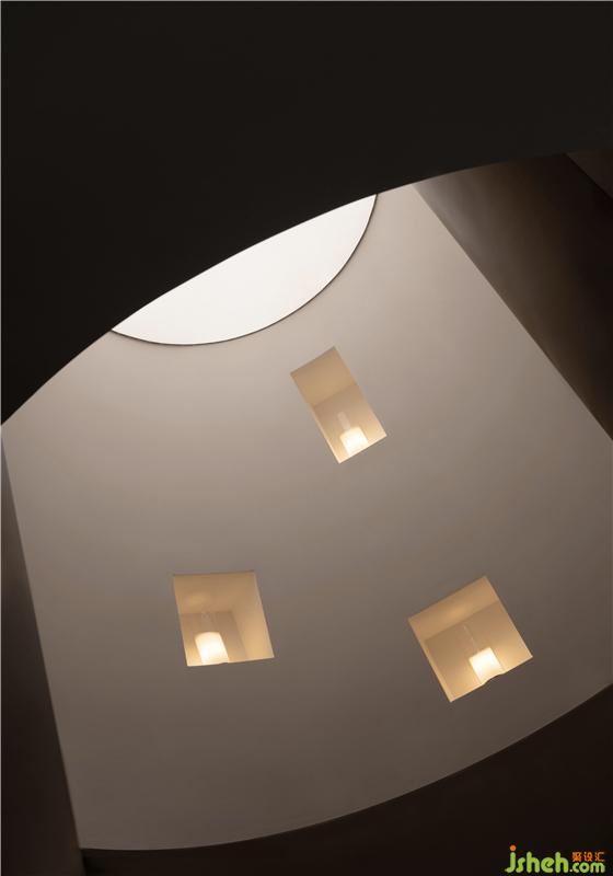 在方舟內(nèi)引入一個(gè)巨大光環(huán)裝置。天光與燈光貫穿使得空間光影霎時(shí)變幻不定。天頂和圓燈的寬闊嵌套,將這個(gè)空間營造得猶如連接外界的垂直管道。