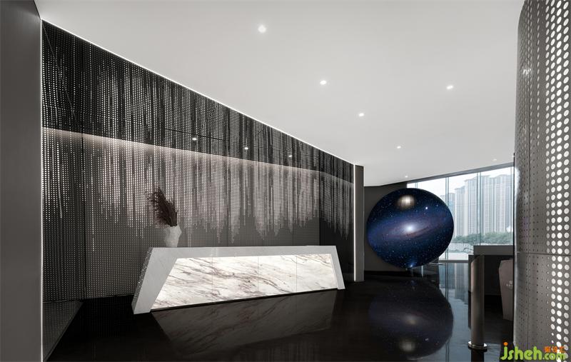 瀑布圖案+沖孔鋁板可視化呈現(xiàn),像星河傾瀉,從前廳旋轉(zhuǎn)樓梯的表面更新形成信息流,盤旋向上傳遞到二層前廳,充滿流動的前衛(wèi)科技感。
