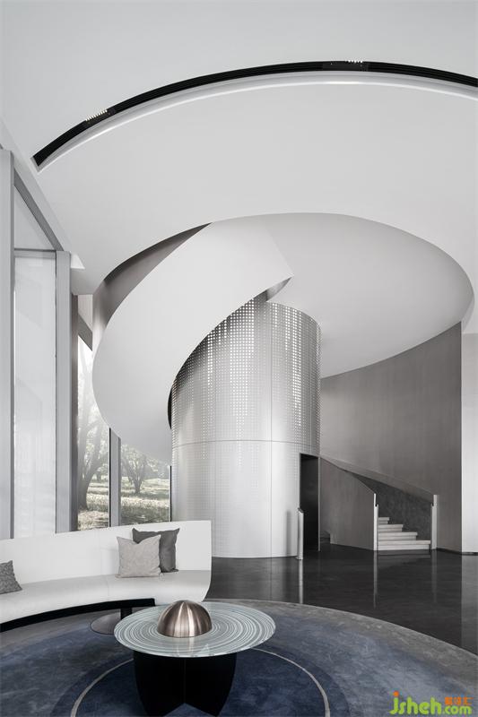 接待廳左前方的休息區(qū),鋪設(shè)深邃的藍(lán)白漸變地毯,營銷中心設(shè)計從“宇宙深處”托出木星造型的金屬茶幾,賦予空間一處“泉眼”,聚集人氣,傳遞“生機(jī)”。這處空間可供太空旅客交流互動,空間以流暢的弧線串聯(lián)起展示和洽談區(qū),大面積落地玻璃幕墻的設(shè)計,溶解室內(nèi)外邊界,將接待廳“放大”。設(shè)計以極簡的純粹,讓渡于人本身、對星空的仰望和無窮無盡的探索。