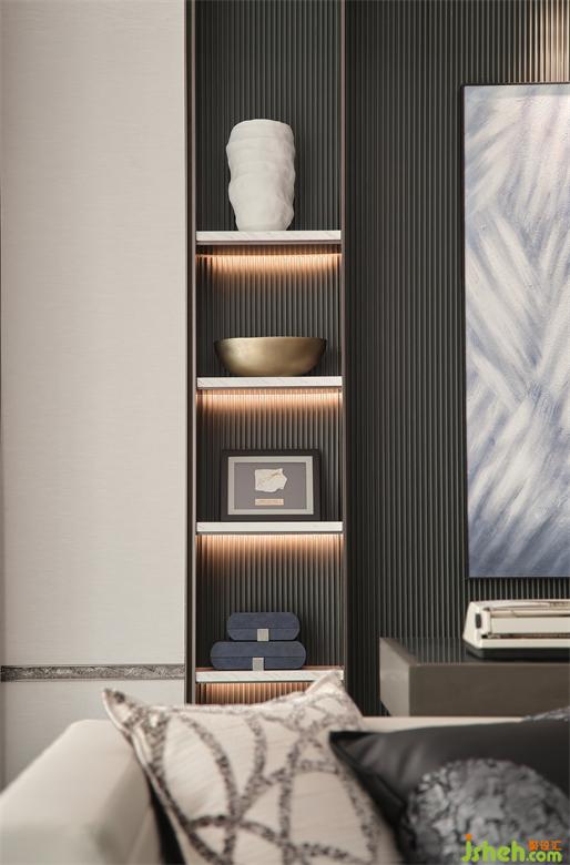 空間優(yōu)雅貫穿于每個角落,藝術(shù)的氛圍延續(xù)至臥室的細(xì)節(jié)之中。軟裝物料從色彩、材質(zhì)、形體上,均結(jié)合東方韻味,凸顯儒雅氣質(zhì)。低垂的光在鏡中掩映,和地面的線光源烘托出安然舒緩的氛圍。通過精致生活體驗的營造,體現(xiàn)住區(qū)未來服務(wù)的細(xì)致入微。