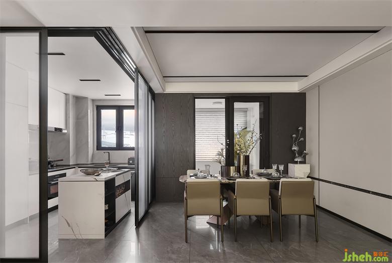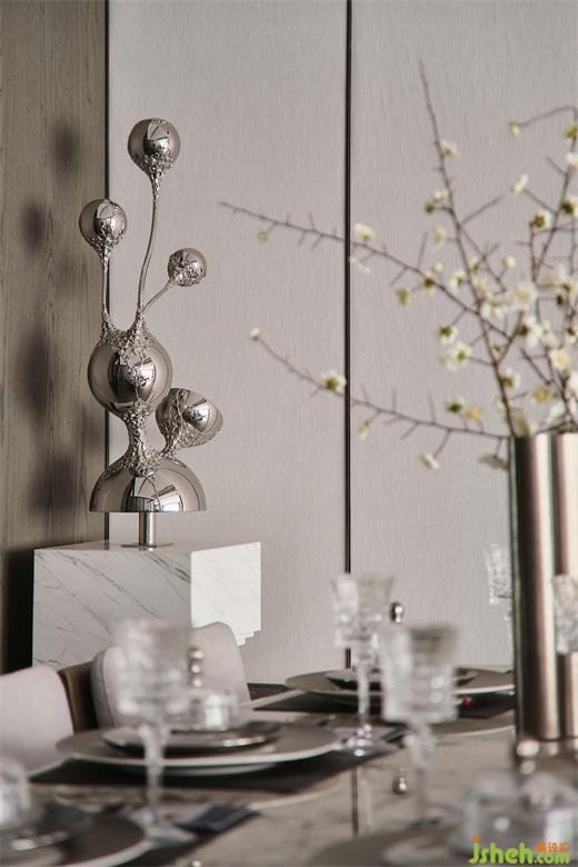 經(jīng)由流動形式的起居動線,移步狹而不促的餐廳區(qū)域,南京樣板房設(shè)計雙面開敞的落地玻璃盡收庭院青翠,風(fēng)拂枝葉帶來自然的綠意搖曳。