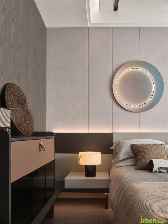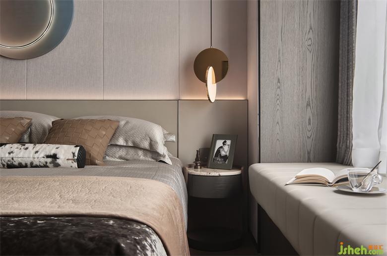 過道式的延伸使我們多了一份暇想,儲物格的面和臺面用同色紋路肌理相結合,延續(xù)了空間的搭配,使整個空間更加協調統(tǒng)一,南京樣板房設計打造出空間獨有的沉靜氛圍提升臥室的觀感。