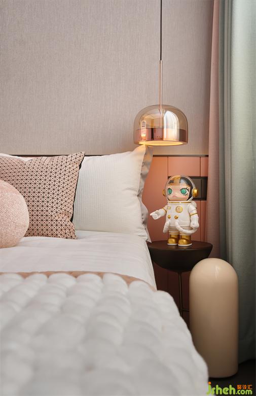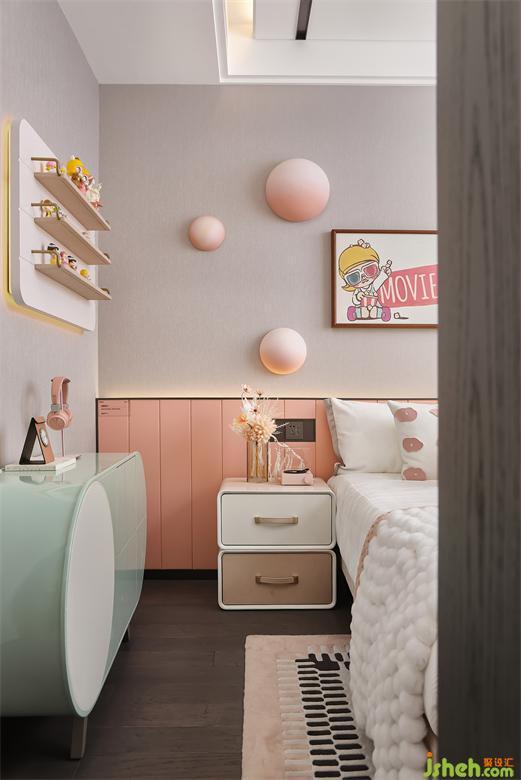 女孩的臥室采用淺粉色為主調,墻壁的油漆肌理隱約展露出揮揮灑灑的設計手法。以此凸顯孩童純真的個性與美好向往。