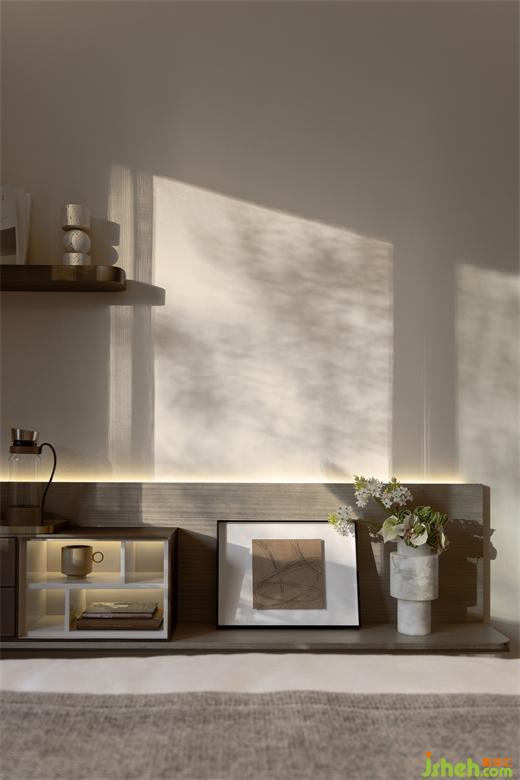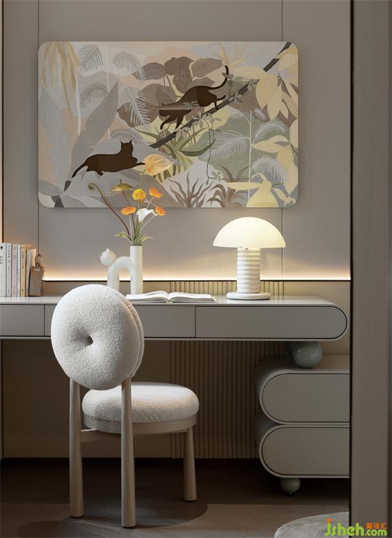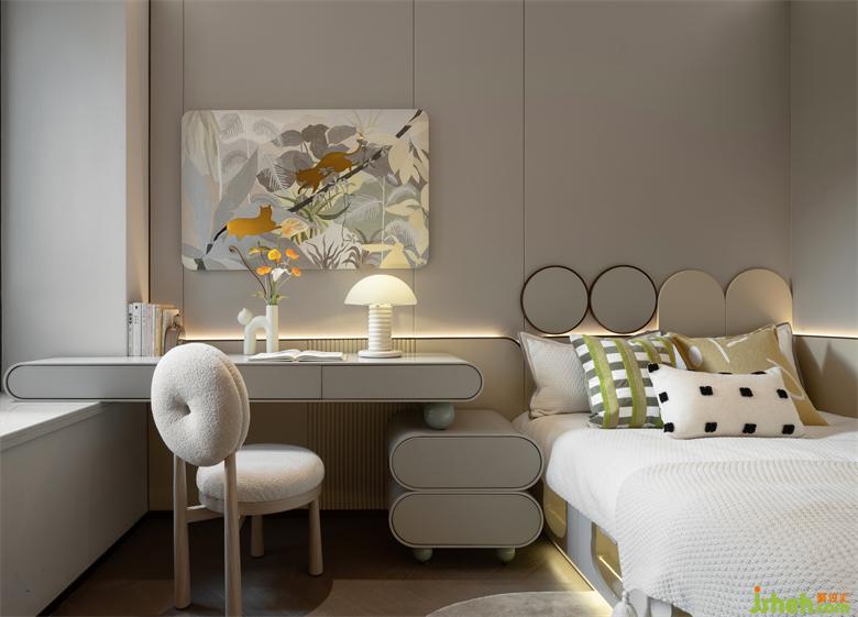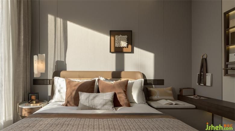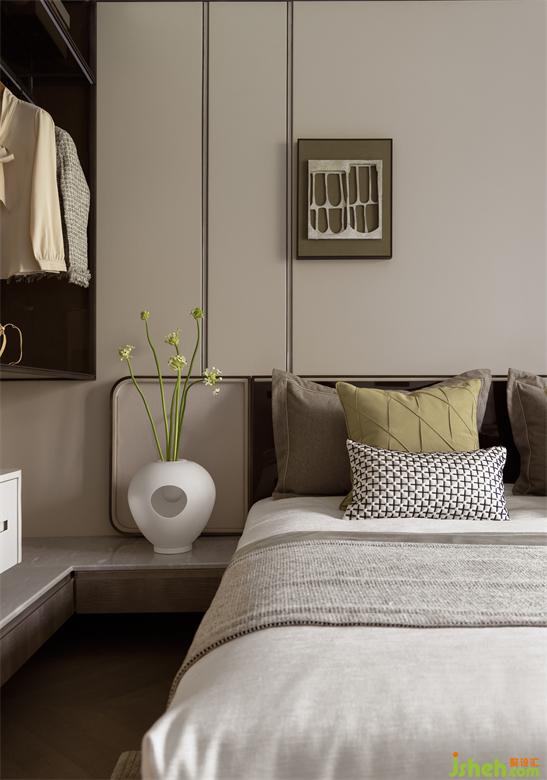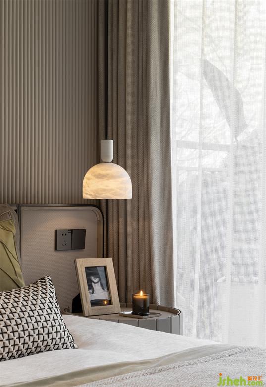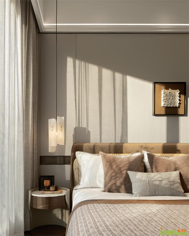 主臥柔和的配色演繹出和緩的空間節(jié)奏,賦予空間更多的舒適愉悅之感,簡單中散發(fā)著一種沉穩(wěn)安定的情緒感染力。沿著空間的脈絡拾步而下,隱與現(xiàn)的藝術轉(zhuǎn)換間,廈門湖畔潤璟樣板房設計將關懷藏于細節(jié)之中,簡素之下。