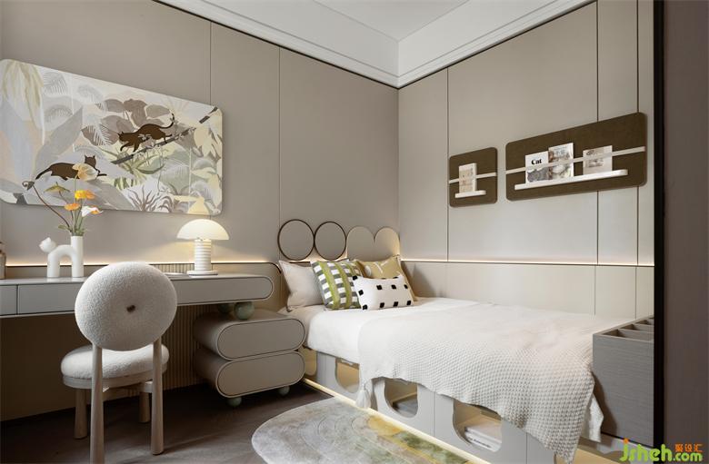 女孩房以貓咪為主題的設計,增加書桌及墻柜功能,打造童趣、與貓玩樂,學習一體的溫馨空間。女兒正是處在夢幻般的年紀,清新甜美的糖果色,線條柔和的童話床靠,都在小心翼翼地呵護著孩子的爛漫與童真。