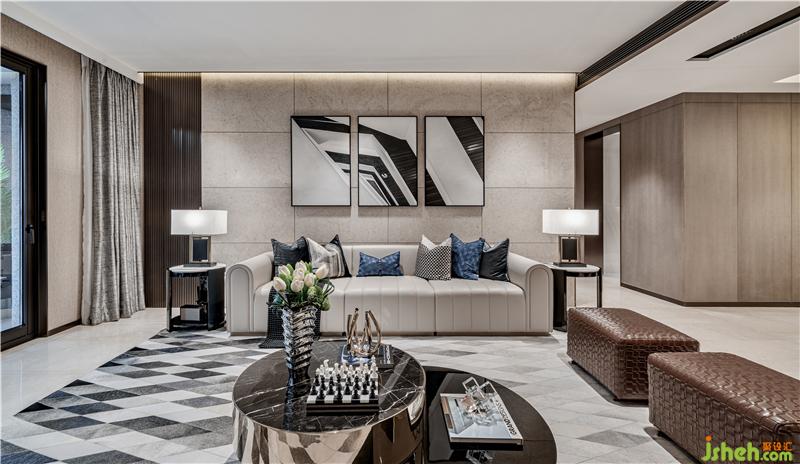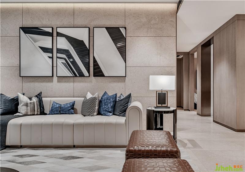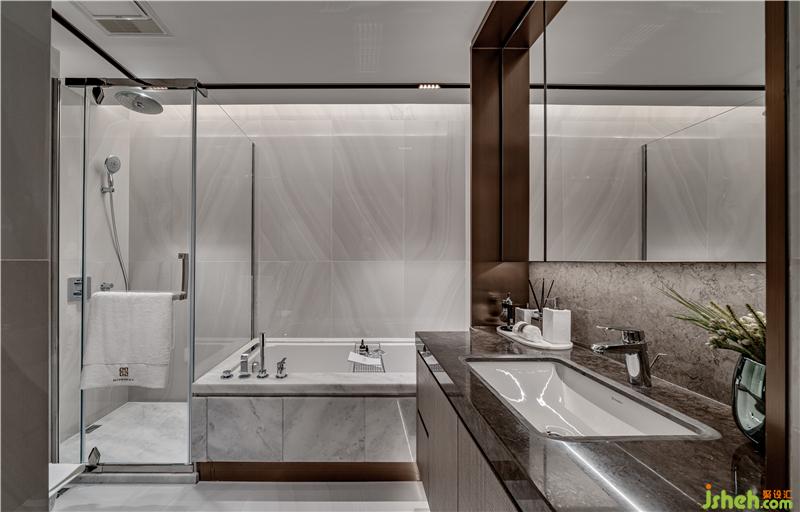 獨(dú)立衛(wèi)生間,墻面與地面由同款石材一體而成,深色材質(zhì)恰到好處的融合與均衡。雙臺盆樣板房設(shè)計,合理的規(guī)劃分割,完美實(shí)現(xiàn)功能與美感的結(jié)合。