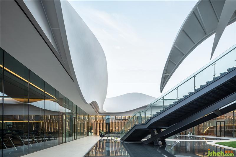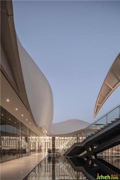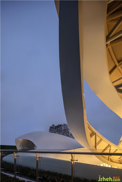 花瓣造型的景觀樓梯,寬約10米,長約15米,鋼結構造型,鋼板拼接覆蓋,造型舒展流暢,展現(xiàn)了力學之美。景觀構筑物本身不是對符號單純的模仿,通過結構柱懸挑出來的結構造型和視覺造型的引導,在功能上引導人們進入地下會所空間。