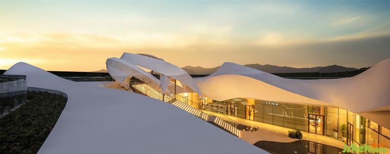 流動的屋面形成自然起伏的山巒形態(tài),線條有機流動,呼應了基地周圍山巒的柔美與飄逸南京售樓處設計,盡顯靈動。不管人身處庭院中或是地面,步移景異,此起彼伏。