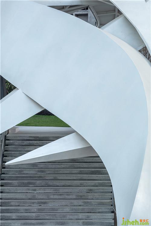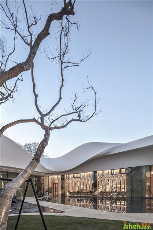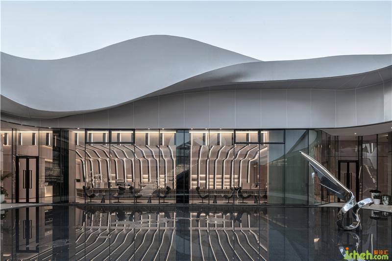 簡潔的落地玻璃將自然光引入室內(nèi),并讓外部獨特的景觀與室內(nèi)空間產(chǎn)生對話關(guān)系,模糊了室內(nèi)外的界限南京售樓處設計。室內(nèi)曲線型的聯(lián)排光帶,將天花和墻面融合而成一整片光之幕墻,曲線造型增添了空間的活力和律動。