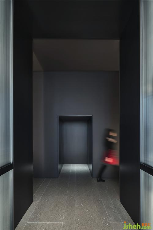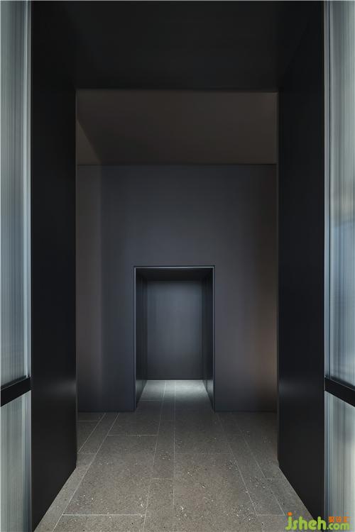過(guò)道的空間尺度刻意收窄,靜謐、冷峻的氣息迎面而來(lái),迅速將人挾裹其中,讓人即可感覺(jué)到空間的震懾力與儀式感!