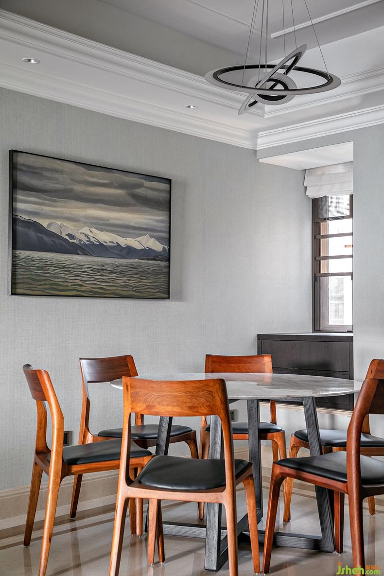 即便在有限的格局里,餐廳的設(shè)計(jì)依然秉持簡約大方、溫潤而雅的格調(diào),室內(nèi)設(shè)計(jì)師用燈光、鏡面柜的設(shè)計(jì),增加空間層次,體現(xiàn)家的明朗和熙、純粹而溫馨。細(xì)節(jié)見品質(zhì)的北歐風(fēng)桌椅、獨(dú)特的燈飾,包括無垠風(fēng)光的陳設(shè)掛畫作選擇,也都頗有大自然的輕盈感,令人放松沉醉,享受這一刻的寧靜與祥和。