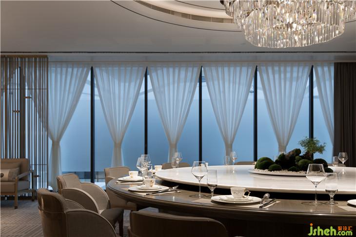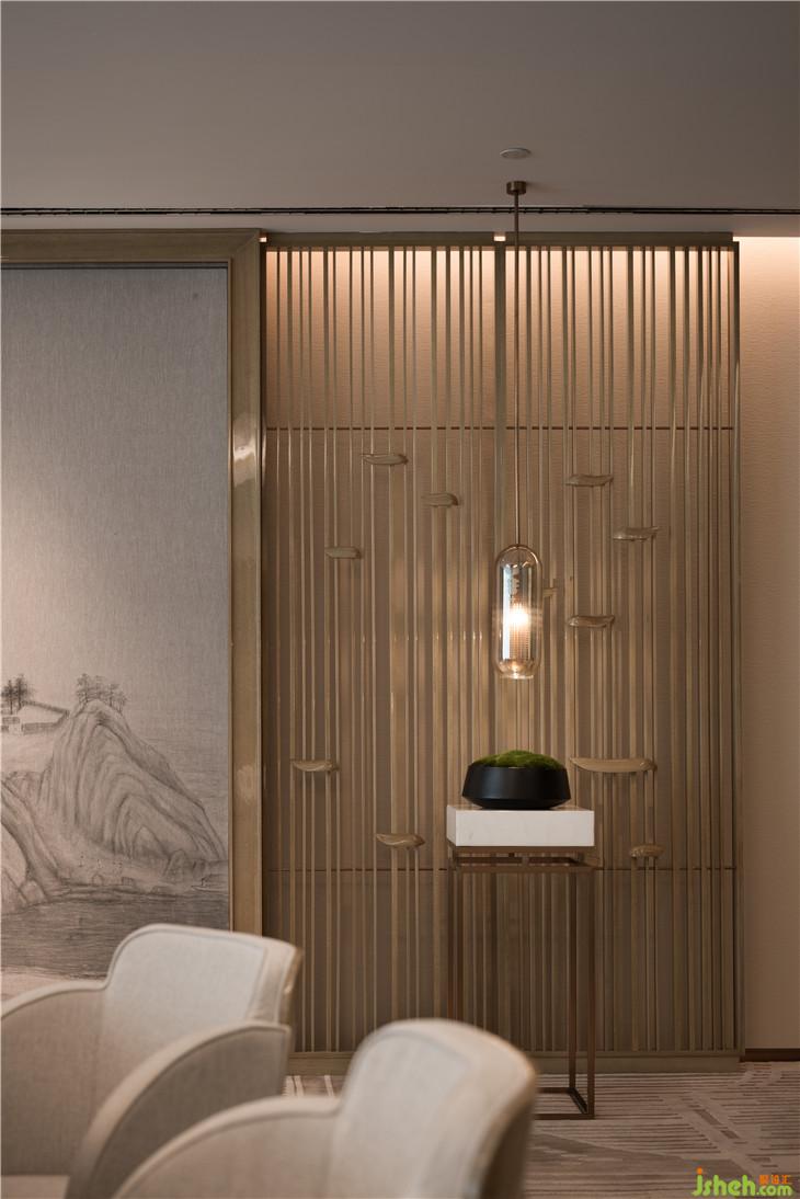 屏風(fēng)的錯(cuò)落隨意的布置尤如海面上的漁船及風(fēng)帆,寓意乘勢(shì)揚(yáng)帆而上鑄就輝煌。吊燈的元素來自項(xiàng)目的地理位置引發(fā)的設(shè)計(jì)構(gòu)思,通過以現(xiàn)代復(fù)合材料進(jìn)行藝術(shù)手法塑造成波浪,追求水波蕩漾的自然感,金屬質(zhì)感邊框做成波光粼粼的點(diǎn)綴。展現(xiàn)設(shè)計(jì)者對(duì)自然及力量的一種追求。