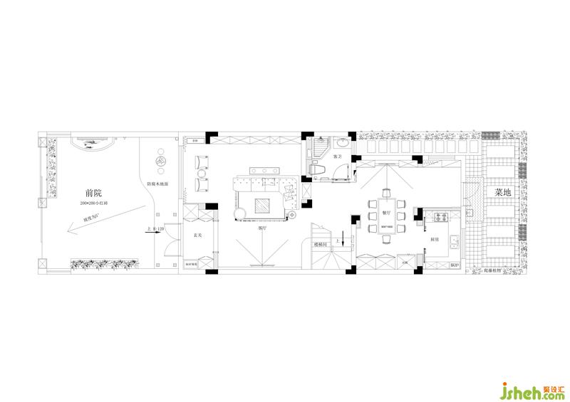一層客廳空間比較大,所以不能按照普通住宅的布局去擺放家具,將沙發(fā)組朝東擺放在中部可以很好的平衡空間;